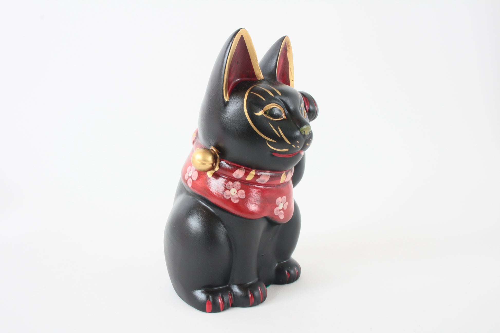 Seto ware Ceramics Manekineko Statue Beckoning Cat Black Cat with left paw raised Ancient Mikawa Style 6.5in made in Japan