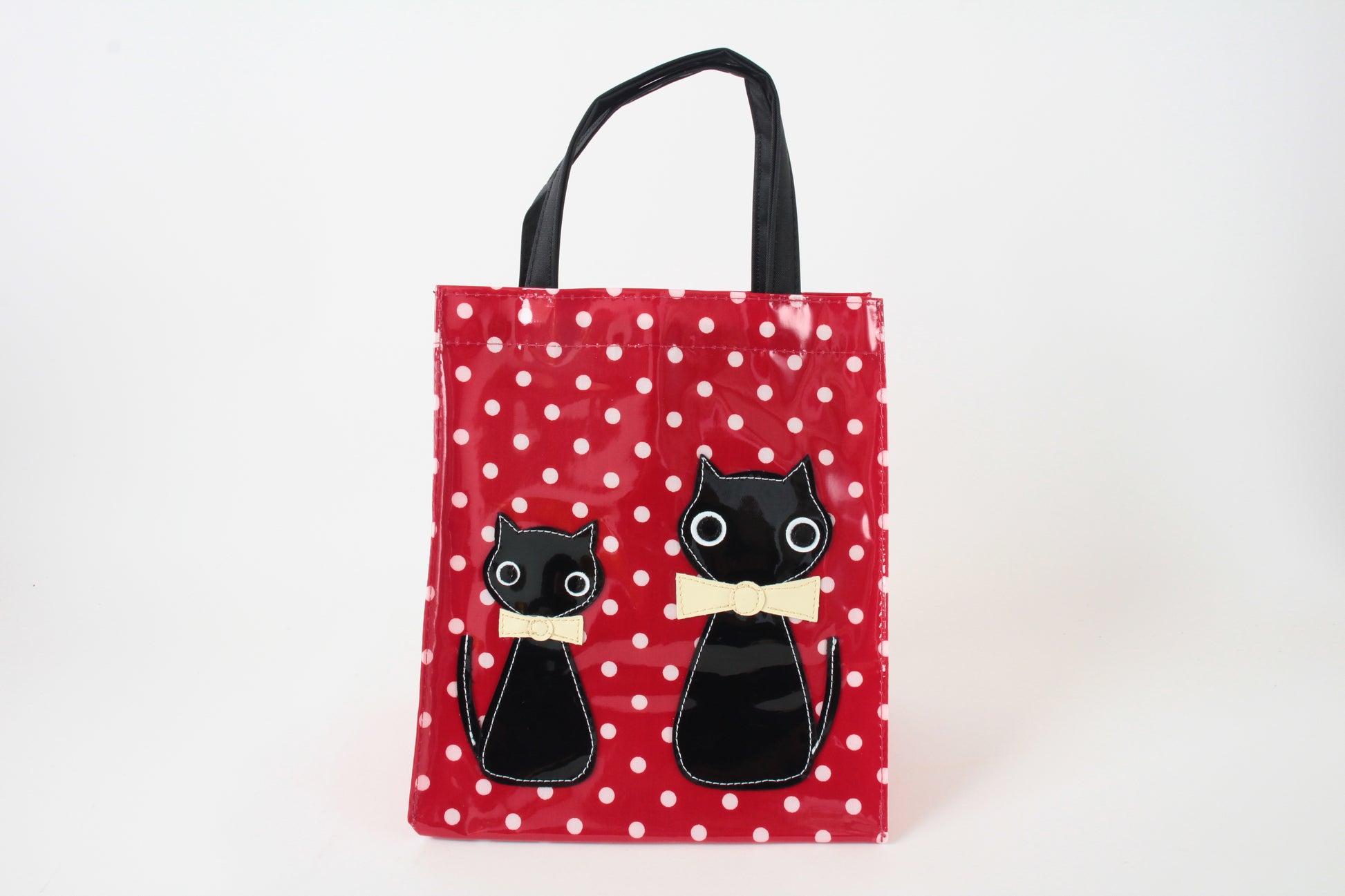 An adorable side bag decorated with a stylish ribbon-wearing cat and a playful dot pattern. The wide gusset provides a stable base to carry your lunch box flat, while its compact yet spacious design is perfect for carrying all your essentials with a touch of Japanese "kawaii" style.