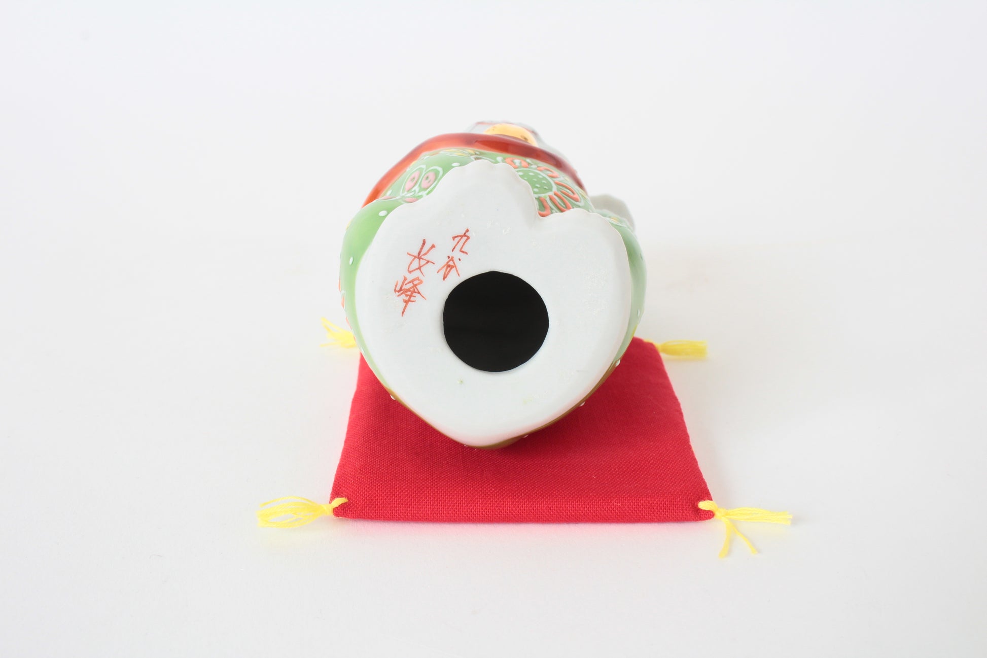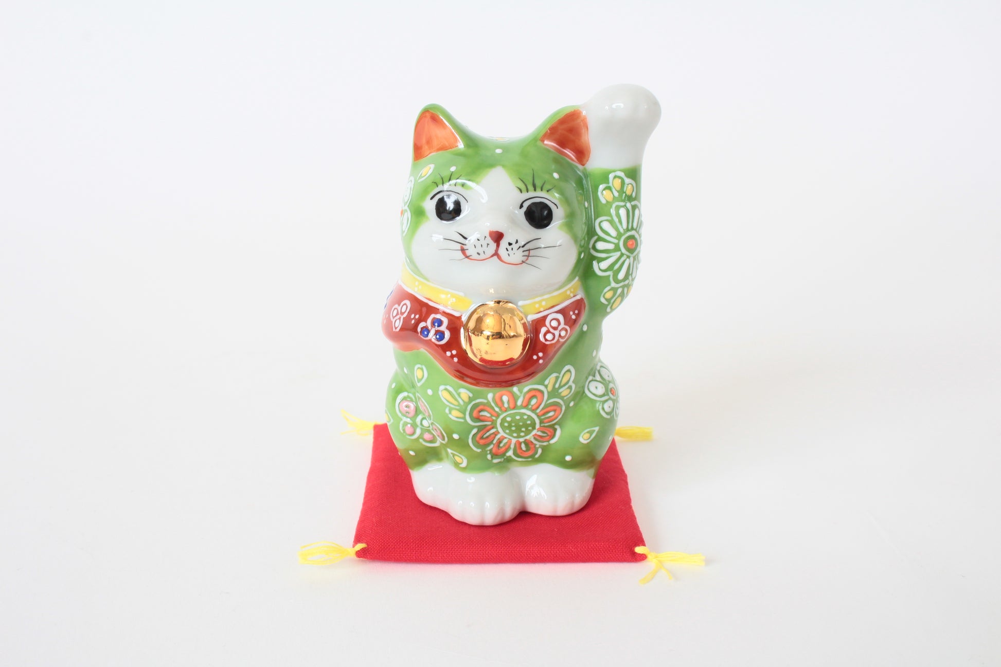 Kutani ware Ceramics Manekineko Statue Beckoning Cat Green Flower Pattern 4.0in made in Japan
